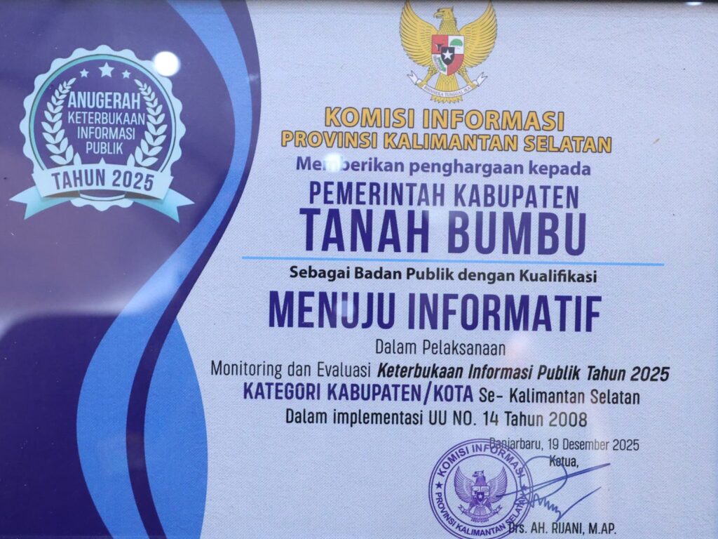 BATULICIN – Komitmen Pemerintah Kabupaten Tanah Bumbu dalam mewujudkan tata kelola pemerintahan yang transparan dan akuntabel kembali mendapat pengakuan. Pada Anugerah Keterbukaan Informasi Publik Tahun 2025, Pemkab Tanah Bumbu berhasil meraih predikat Menuju Informatif dalam ajang Monitoring dan Evaluasi (Monev) Keterbukaan Informasi Publik yang diselenggarakan Komisi Informasi Provinsi Kalimantan Selatan.