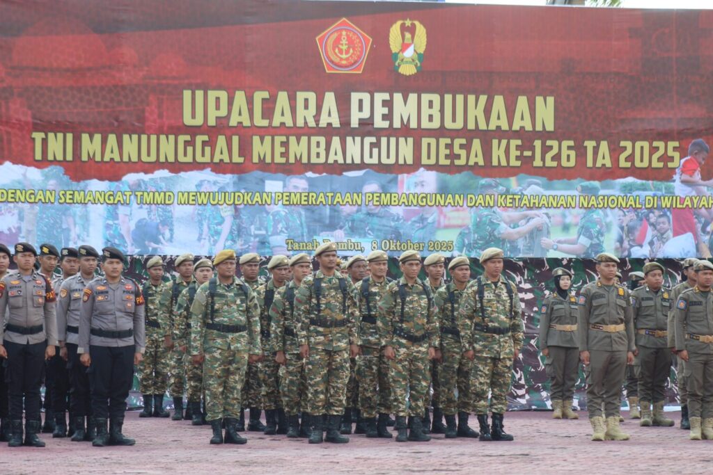 BATULICIN – Program TNI Manunggal Membangun Desa (TMMD) ke-126 Tahun Anggaran 2025 resmi dimulai di Kabupaten Tanah Bumbu. Upacara pembukaan berlangsung khidmat di Halaman Kantor Bupati Tanah Bumbu, Rabu (8/10/2025), dengan Bupati Andi Rudi Latif bertindak langsung sebagai Inspektur Upacara.